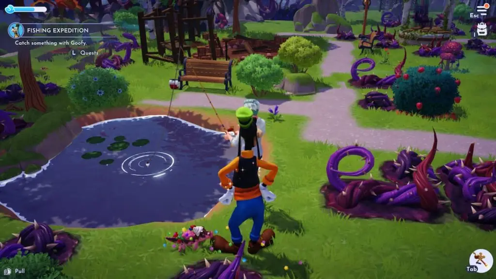 The ponds will bubble. In entrance of a kind of ponds will likely be a fishing rod. Pick it up and go to Goofy’s home, the place he’ll commerce the damaged fishing rod for a working one.